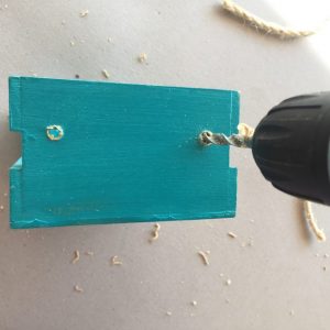 2- Realizamos las perforaciones con una mecha para madera del tamaño aproximado del hilo/cuerda que vamos a utilizar para las manijas (yo use una de 6 1/2 pulgada).